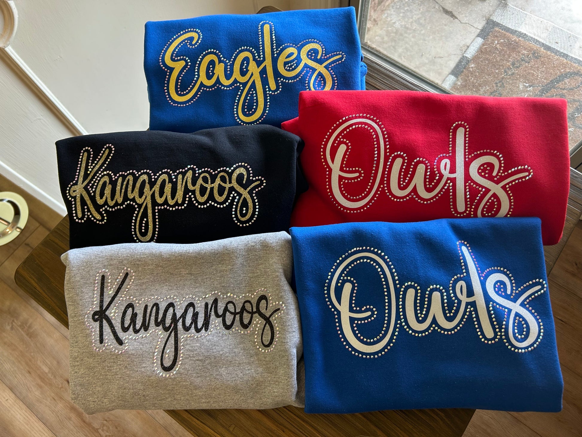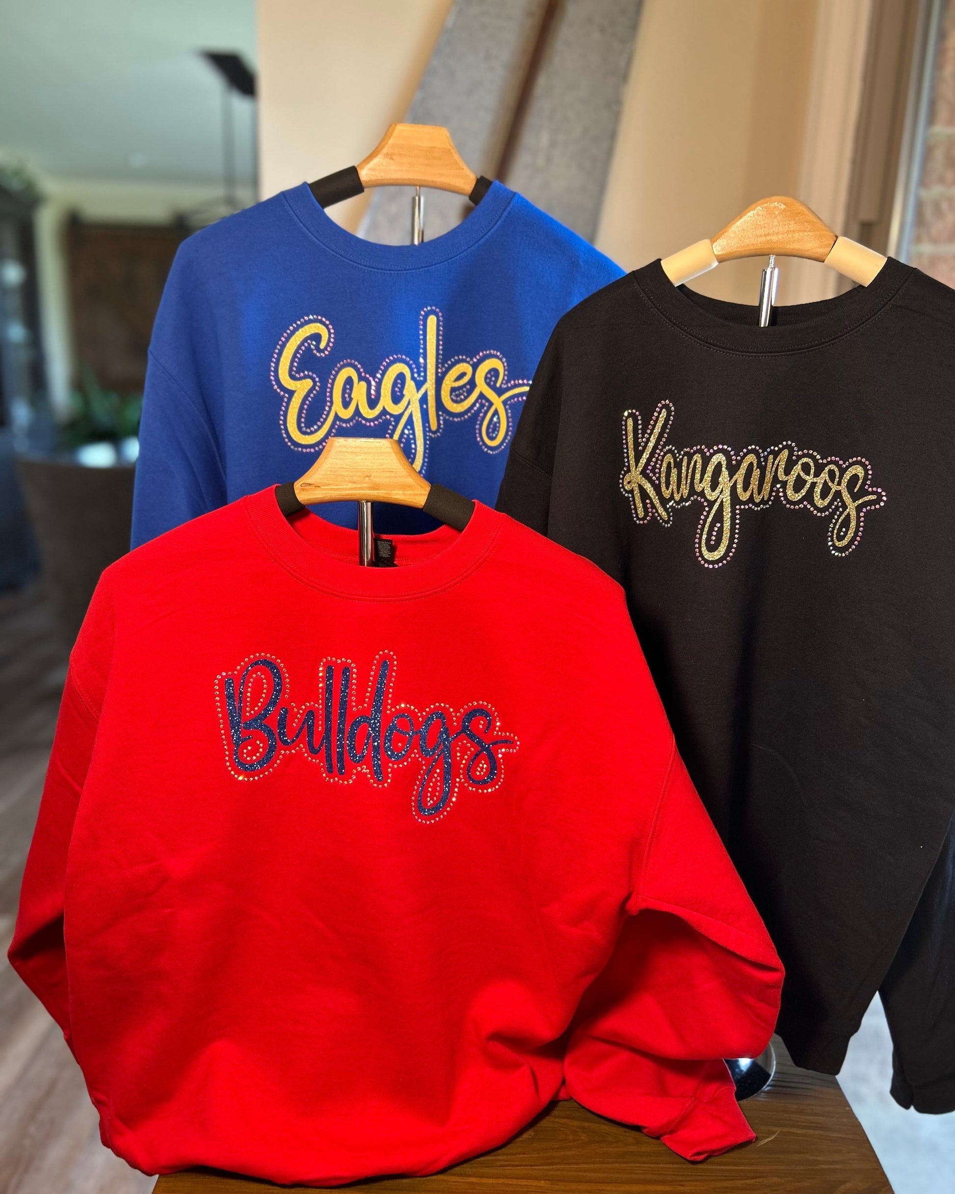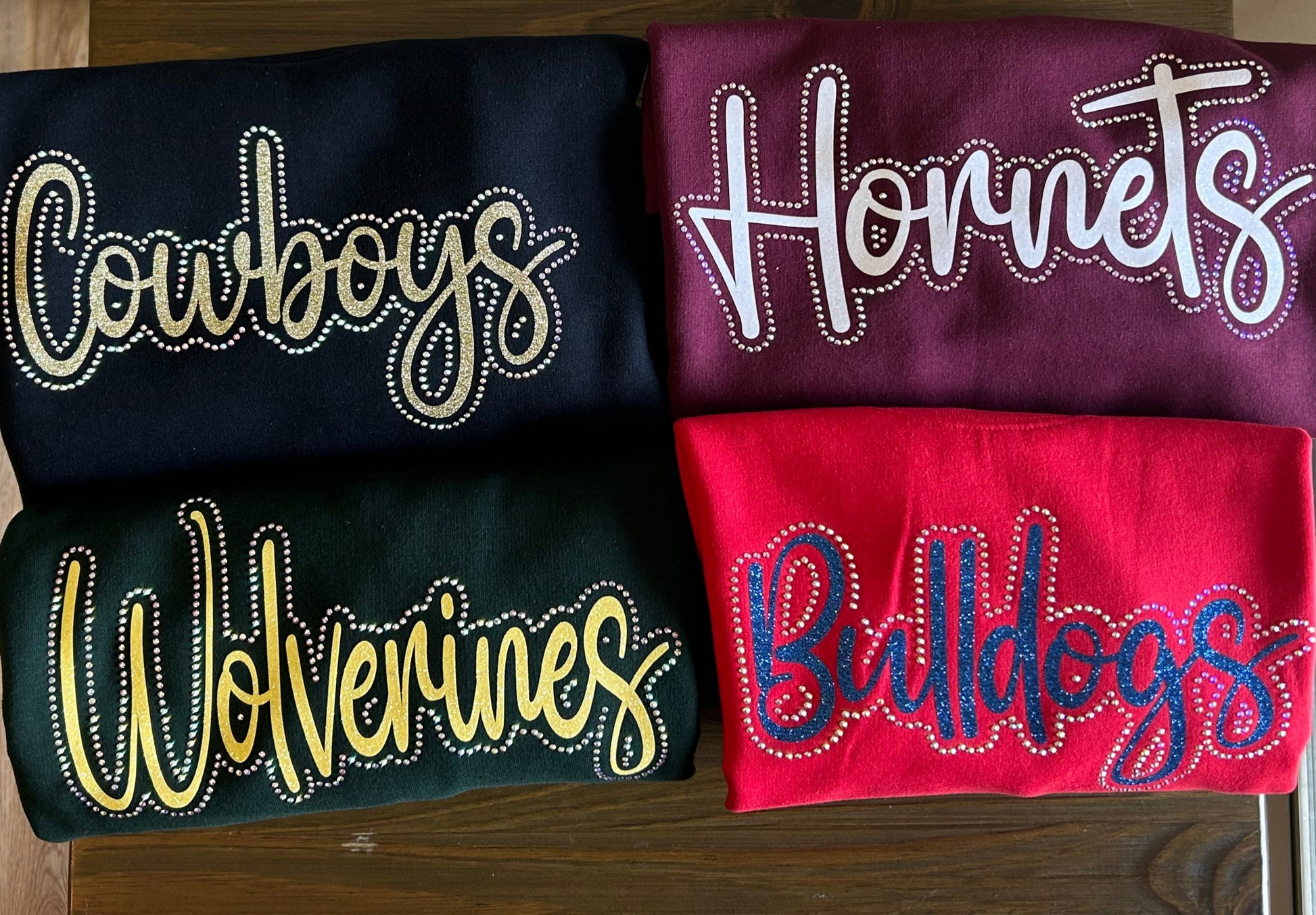 Celebrate your team spirit in dazzling fashion with our Rhinestone Mascot Sweatshirt! The team name sparkles brilliantly in rhinestone lettering, turning every cheer into a shining moment. Crafted for comfort and style, this sweatshirt is perfect for game days, casual hangouts, or anywhere you want to show off your pride. Personalize your look by selecting both the sweatshirt color and the team name color to create a unique statement. Remember, we only accept exchanges for defective items—so get ready to sparkle, support your team with confidence, and stand out wherever you go!